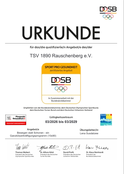 Der TSV 1890 Rauschenberg e.V. bietet seit Jahren Rückenpräventionskurse an. Pro Kurs finden zehn Trainingseinheiten unter der Leitung von Lena Susdalzew statt. Die Kurse finden immer Donnerstags von 18.00 bis 19.30 Uhr in der Kratz`schen Scheune in Rauschenberg statt.